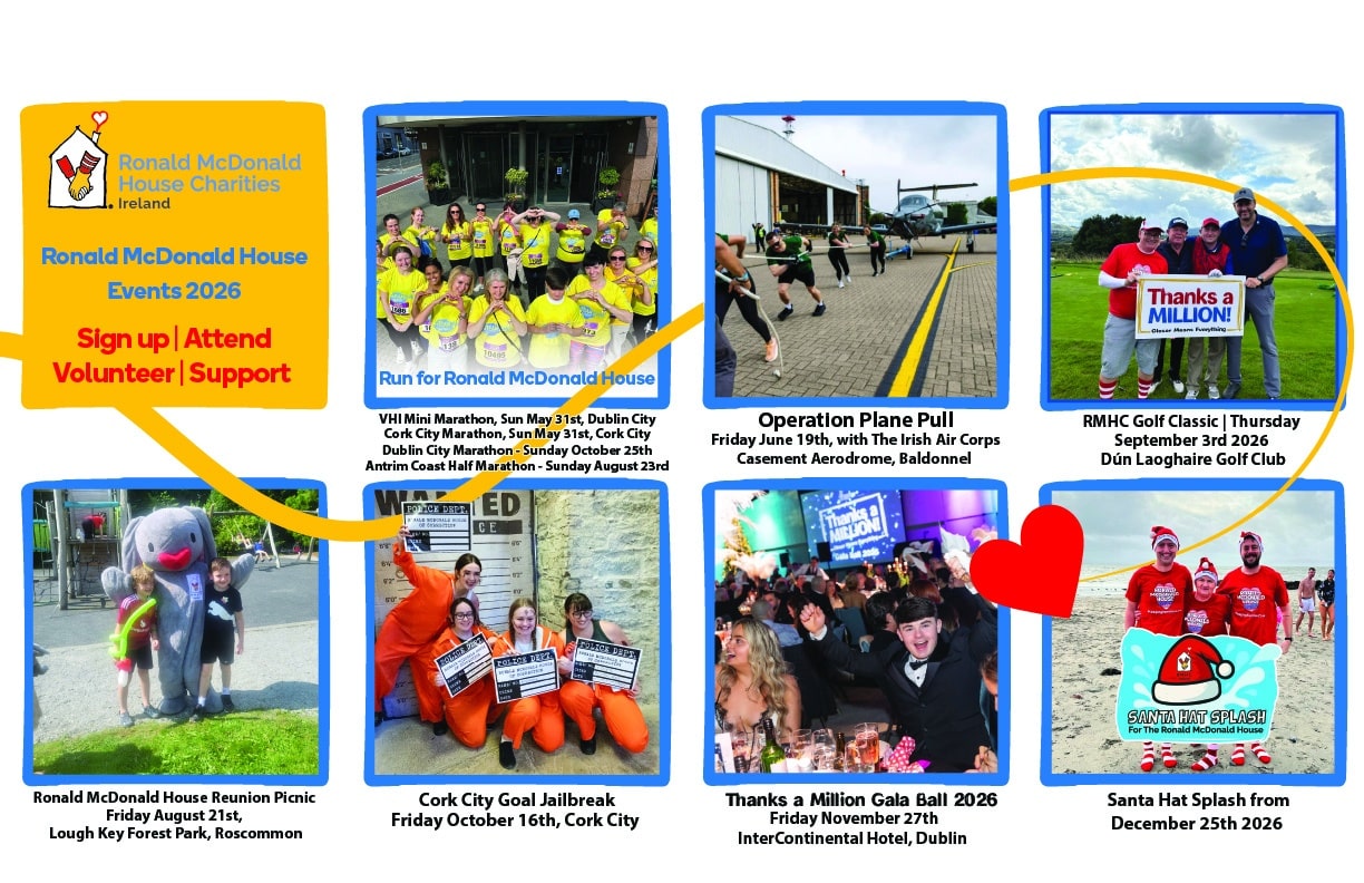 Get ready for a year of unforgettable moments—all in support of families with seriously ill children. Ronald McDonald House Ireland’s annual events are back and bigger than ever! From the elegance of the Spring Ball Cork, to the challenge and thrill of the Cork Jail Break, the fun-filled Reunion Picnic 2026, the competitive spirit of the Ronald McDonald House Golf Classic 2026, the glamour of the Thanks a Million Ball 2026, and the festive splash of the Santa Hat Splash 2026.